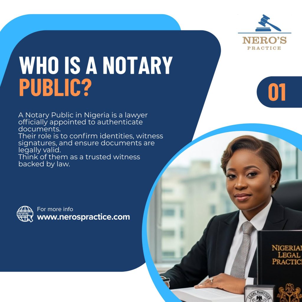 A Notary Public in Nigeria is a legal officer appointed by the Chief Justice of Nigeria to perform specific official and legal functions. Their main role is to authenticate documents and transactions, especially those that will be used outside Nigeria or require a high level of legal credibility.